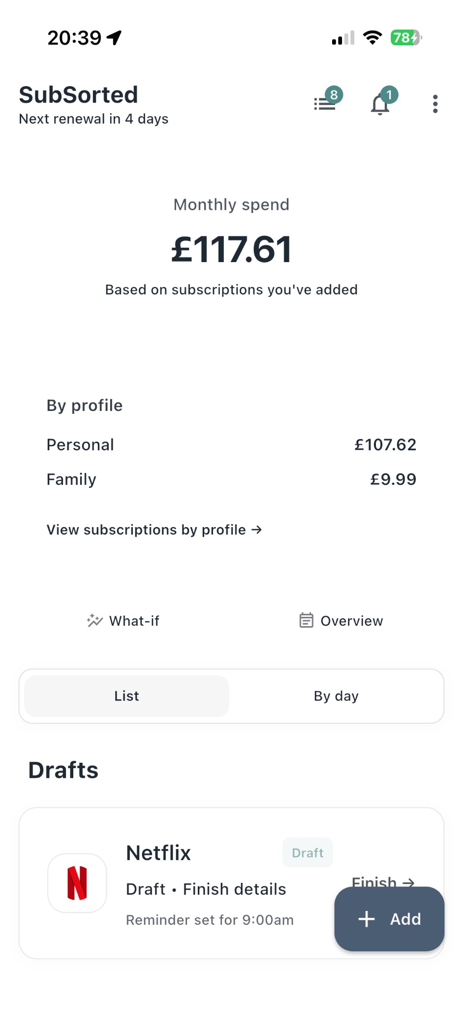 Available on iOS. Android coming soon. Add your first subscription in under 2 minutes. No account required.